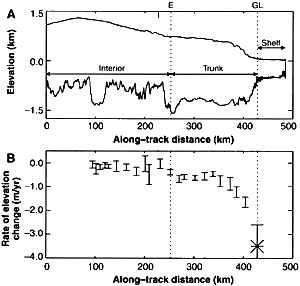 The Pine Island Glacier is a principal outlet glacier of the West Antarctic Ice Sheet draining into the Amundsen Sea. The ice stream is 40 km wide as it reaches the sea. Recent retreat, thinning and acceleration have focussed attention on this glacier. This is a brief note in support of a RealClimate article. The grounding line is of principal concern here. This is where the glacier goes afloat. The grounding line is where the bottom of the glacier comes in contact with the ground, in this case the sea bottom. The grounding line is an anchoring point for the outlet glaciers. The length of the glacier that is grounded is being both slowed and stabilized by the basal friction. Beyond the grounding line toward the margin the floating ice shelf is susceptible to a rapid calving retreat and as the grounding line retreats, so would the calving front. Note in the image below that the current grounding line is on relatively high terrain, but is close to a deep basin. The annotated image below is from a British Antarctic Survey image, taken from their autosub program exploring beneath the ice shelf of the Pine Island Glacier combined with data from radar altimeter data flown by NASA. The second image below is a profile of depth under Pine Island Glacier from (Shepard et al, 2001)that indicates that beyond the grounding line the depth remains more than 1000 meters below sea level for approximately 200 km.