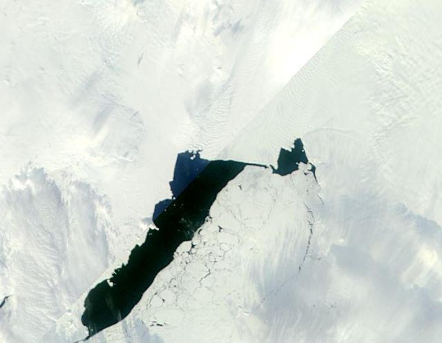 On October 5, 2011 MODIS imagery indicates no rift. By Sept. 17, 2012 a second rift parallel to the first had developed.