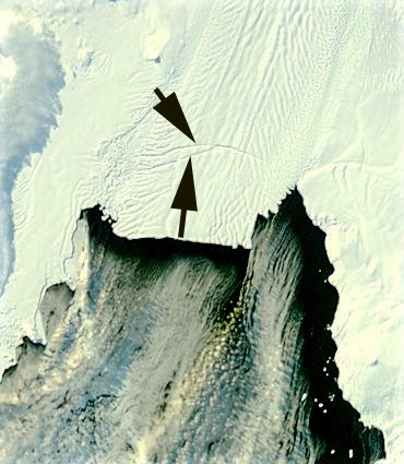 Grounding line retreat could lead to the glacier retreating into this basin, not a stable situation. Basal melting is of particular concern, has been calculated to exceed 15 m/year. In addition the formation of basal crevasses which are much wider than surface crevasses may be critical in the rifting process. The British Antarctic Survey, NASA and several universities in particular have been focusing on this glacier. The second image shows the grounding line in the surface. This is an annotated satellite image from NASA. Just above the grounding line you can note that the surface of the glacier has some large scale roughness which indicates the impact of the sub-glacier topography.
