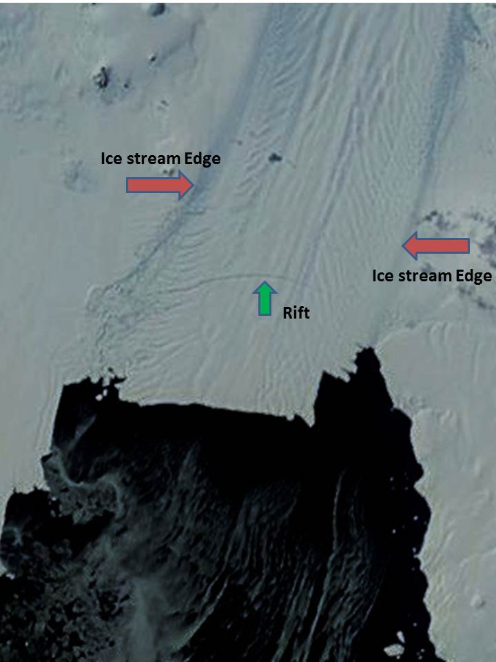 This topography acts to slow and buttress the glacier. This area is above the topographic rise from the deep basin to the higher terrain of the current grounding line. The ongoing focus on the Pine Island Glacier will be fascinating to watch. In particular the emphasis on the oceanographic aspects beneath the ice shelf. The melt rates beneath the ice shelf are significant, on the order of 15 m/year. This is an aspect that has received less attention and will certainly yield interesting results, considerable technologic frustrations and innovations. The nearby Smith Glacier has experienced a similar inland spread of rifting and retreat. In 2011 an additional rift has formed that is 20-25 km inland of the calving front, first noted by NASA’a Operation Icebridge. November 3, 2011 MODIS imagery is seen below. The rifts in both 2001 and 2011 have begun on the east edge of the ice stream an propogated westward. The propagation is more likely as an exploitation of basal crevasses then surface crevasses. The rift from 2011 led to iceberg formation in the fall of 2013 as seen in MODIS images.