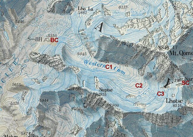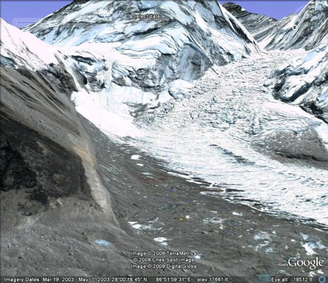 Given the slow rate of retreat and the 3000 m of altitude range above the current snowline the Khumbu Glacier is not in danger of disappearing with current climate. The entire Western Cwm the flat cirque seen beneath Nuptse, Lhotse and Everest here is in the permanent snow zone above 6000 m. The icefall then descends to 5400 m. The terminus is at 4900 m. It is not difficult to imagine this lower section of the glacier below the icefall wasting away. It is likely that a substantial proglacial will develop as is occurring at Ngozumpa Glacier and has occurred at Imja Glacier.
