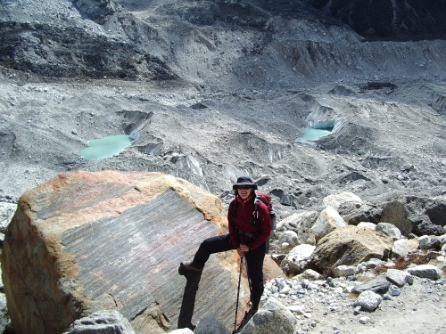 The Khumbu Glacier is a large debris-covered glacier in the Khumbu region. It is one of the more famous and often visited Himalayan glaciers as it is the key route for climbing Mount Everest. About 12 km long, it drains mainly from the West Cwm between Mt. Everest and Lhotse and ranges in altitude from over 8000 meters to 4900 m. The equilibrium line separating the region where snow typically persists through the year is 5600 m. Melting is very limited above 5800 m. The famed Khumbu Icefall transitions the glacier from the accumulation zone to the ablation zone. The ablation zone is where melting dominates. Base camp for climbing expeditions is on a debris covered portion of the glacier below the Khumbu Icefall, Pumori Lake is about one mile away. The debris cover is brought down by avalanches and exposed at the surface via melting. In the lower picture it is evident that the lower 10 km of the glacier is dominantly debris covered.