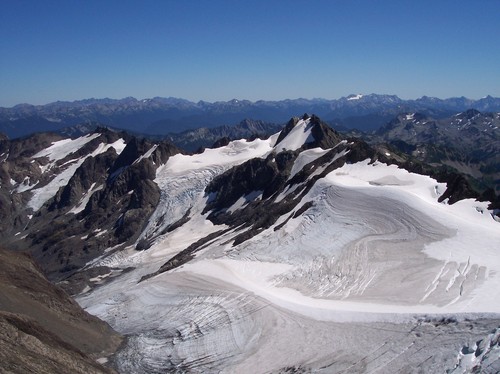 The greatest concern is the emergence of bedrock outcrops in the midst of the glacier since 1994, burgundy arrows in the 2009 image. This is a key symptom of a glacier that will not survive (Pelto, 2010). This is leading to the breakup of the glacier into smaller easily melted segments. This is a process that we have observed lead to the demise of glaciers like the Hinman Glacier. The emergence also indicates the thin nature of the glacier. The view of the glacier from 2005 illustrates the small area of the glacier that is retaining snowpack, this is not a good sign for survival of this glacier.At the end of the summer melt season a glacier needs to be at least 50% snowcovered, to survive it must have a consistent significant area of snowpack. In 2005 in this August picture only 20% of the glacier is snowcovered and by summers end it was 5%.