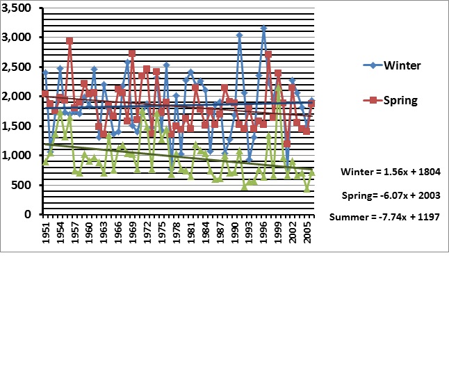 The consequent glacier runoff has declined by 750,000-850,000 ft3/day in the summer since 1980. The resultant annual hydrograph for the Elwha River is not the same as it was before dam construction. In particular late summer and fall salmon runs will experience less runoff due in part to declining glacier runoff. Streamflow in the Elwha River has declined 25% during July-Sept. for the 1950-2006 period. The mean summer flow from 1950-1991 was 1034 cfs. From 1992-2009 only two summers had mean streamflow above 1034 cfs. The decline in glacier size is not the principal cause of the summer streamflow decline, but it further reduces the summer low flows. Updated 12/14/2011