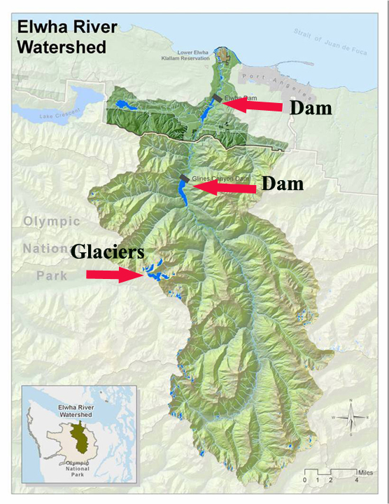 . At the headwaters of this stream are two named glaciers Carrie and Fairchild, and four unnamed glaciers, which play an important part in the hydrology of the watershed. The glaciers have retreated considerably since the building of the dams, rapidly since 1980. The result is a significant reduction in late summer glacier runoff than when the stream last flowed naturally. The construction of Elwha Dam (1913) and Glines Canyon Dam (1927) devastated the Elwha River’s salmon runs. Dismantling the Elwha and Glines Canyon dams over the next two years will allow the river to flow freely for the first time in nearly 100 years. The river will run from its headwater glaciers to the sea. Dams alter streamflow by withholding water and then releasing the water to generate power during peak demand periods. This leads to unnatural flows, which interrupt natural variations that are critical to the fish and wildlife species. Besides the ongoing dam removal recent climate change is altering the seasonal flow of the Elwha River. The loss of glacier area has and will lead to ongoing significant changes in summer streamflow in the Elwha River. In the Elwha River from 1950-2006 summer streamflow declined by 25%, spring streamflow by 17%, and winter streamflow increased by 6%. Part of this change is due to the loss of glacier extent in the watershed.