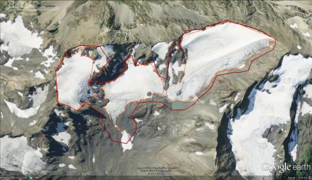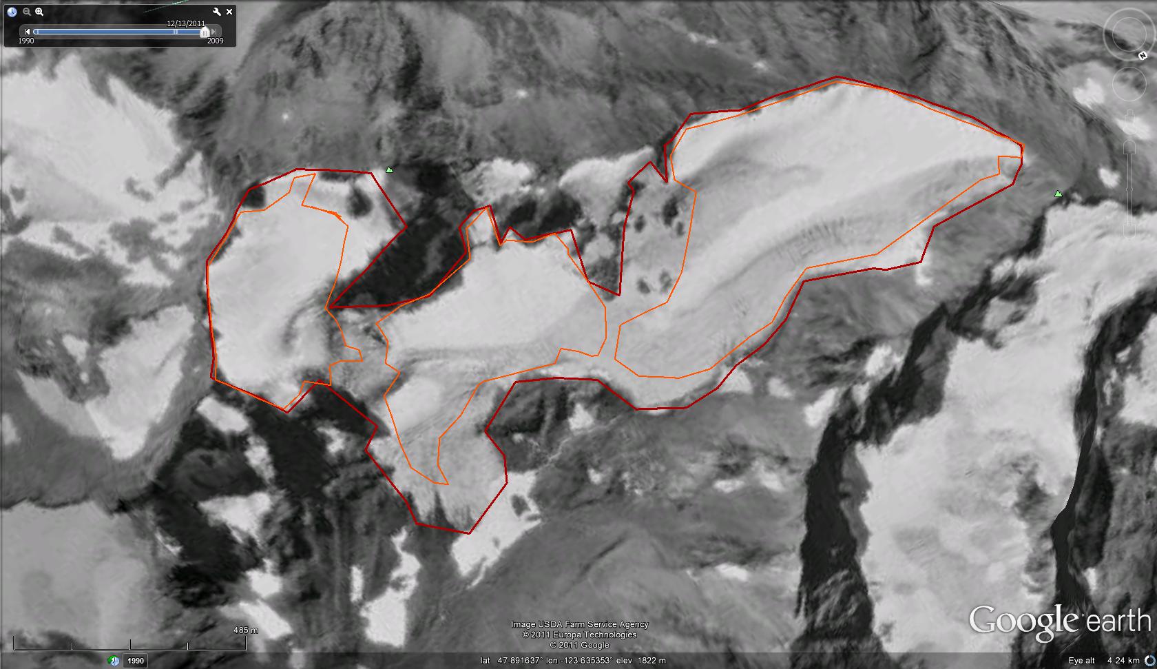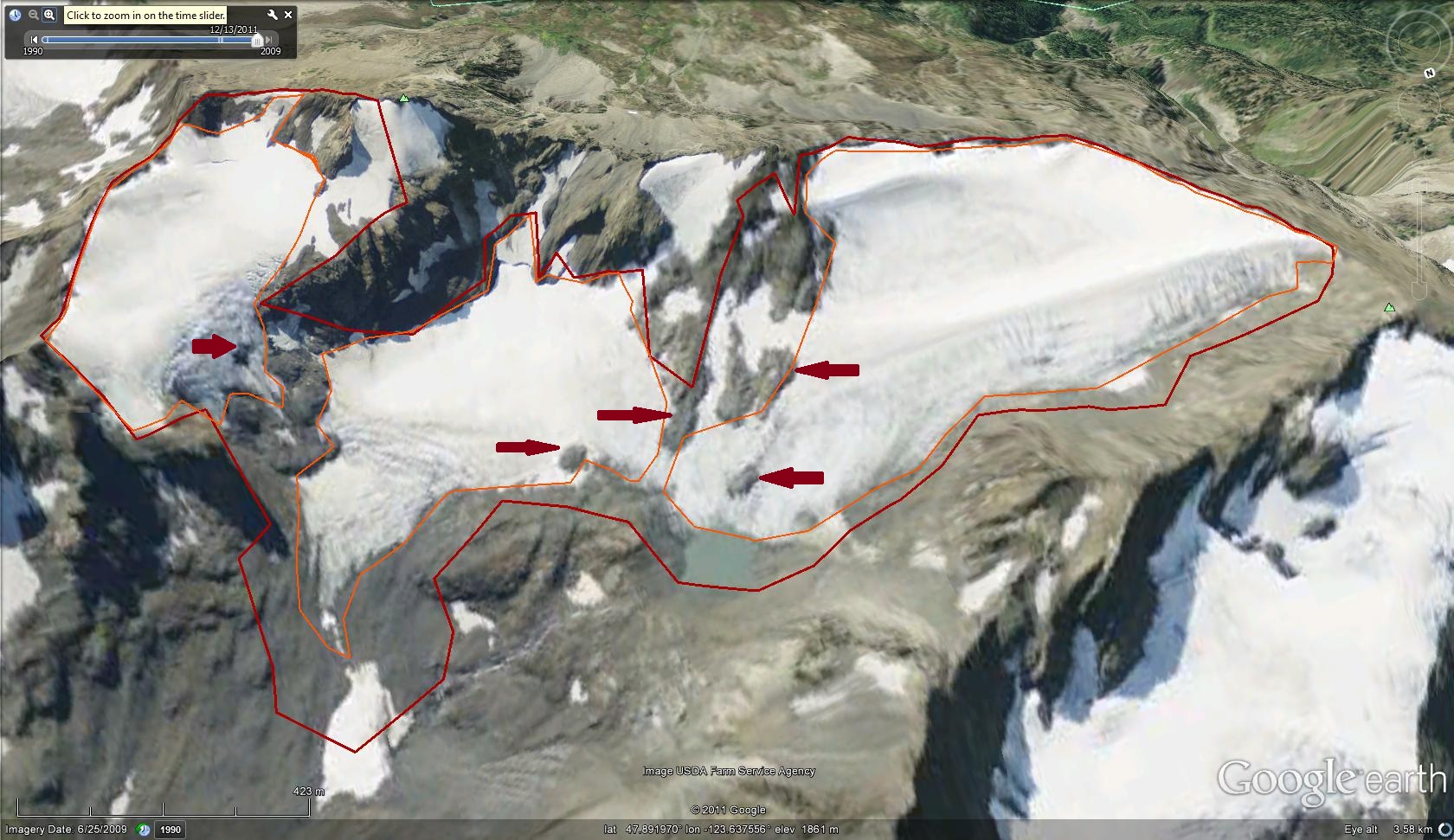 Fairchild Glacier retreated 300 meters from 1950-1994, topographic map versus aerial photograph, green versus red line. From 1994-2009 another 240 m of retreat occurred as indicated by the orange line. In addition the Fairchild Glacier has separated into three sections by 2009.