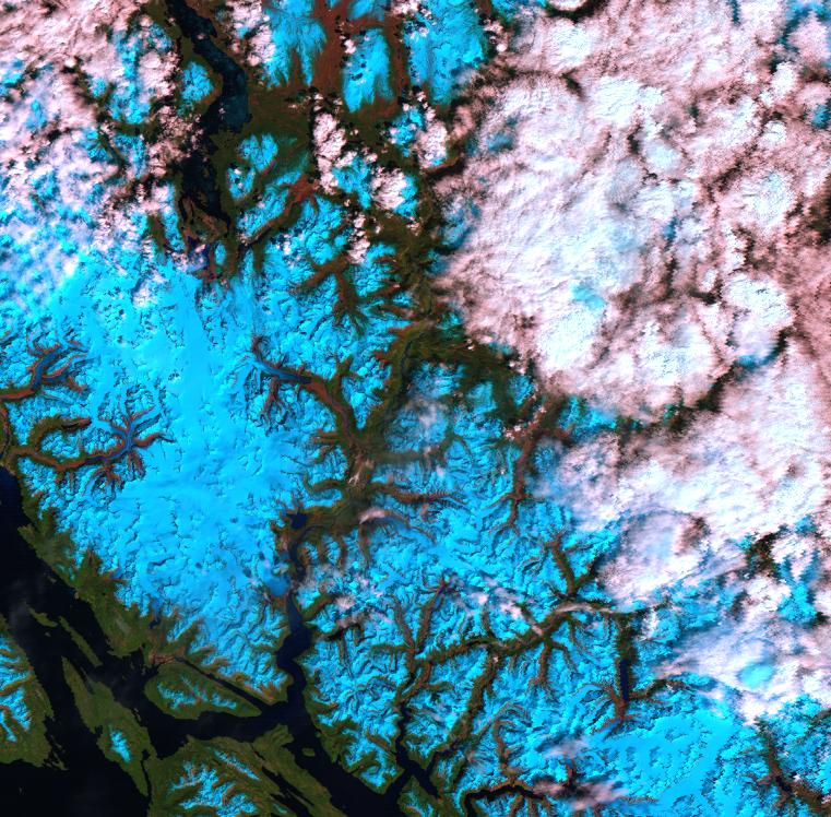 On the ground the Juneau Icefield Research Program measures the snow depths and snow melt during July and August. The above images from May 26, July 29 and Sept. 15 2006 indicate the rise of the ELA during the course of the melt season, from 1200 to 2600 to 3200 feet. Snow depths at the the Sept. 15 ELA, where snowpack=0, was 2 m on July 22. Thus, we had 2 meters of snow melt at 3200 feet between July 22 and Sept. 15. In 2004 the snowline was at 2800 feet on July 15, snowpack was 1.6 meters at the eventual Sept. 1 snow line of 3400 feet. In 45 days 1.6 m of snow was lost at 3400 feet. In 2004 the melt rate was 0.036 meters per day and in 2006 0.038 meters per day. In 2009 July began with a low ELA of 500 m after a cool snowy winter and spring. By the end of the month the ELA was over 800 meters. This 300 meter rise and the associated melt was a record for July as were temperatures in Southeast Alaska in July 2009. As the 2010 melt season begins the Taku Glacier remains snowcovered, though the blue colors near the terminus indicate melt water is saturating the snowpack on 4/10/2010. What will the 2010 melt season bring? Check back here to see.