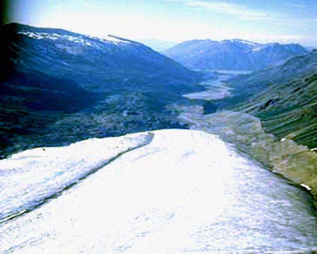 The Hoboe glacier is a distributary tongue of the Llewellyn Glacier draining the Juneau Icefied in Northwest Britsh Columbia. In 1984 I had the opportunity to hike the length of the glacier carrying supplies to the terminus for a master thesis research project of Richard Campbell at the Univ. of Idaho, during the JIRP summer field season. The glacier is 4 km long separating from the Llewellyn Glacier at 3800 feet and ending at approximately 3000 feet. This is our view from the glacier surface notice the evident trimline above the ice surface showing how thick the glacier used to be.