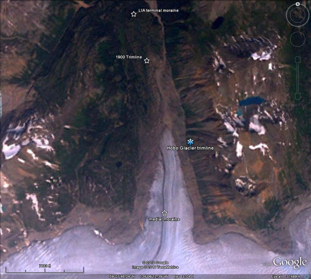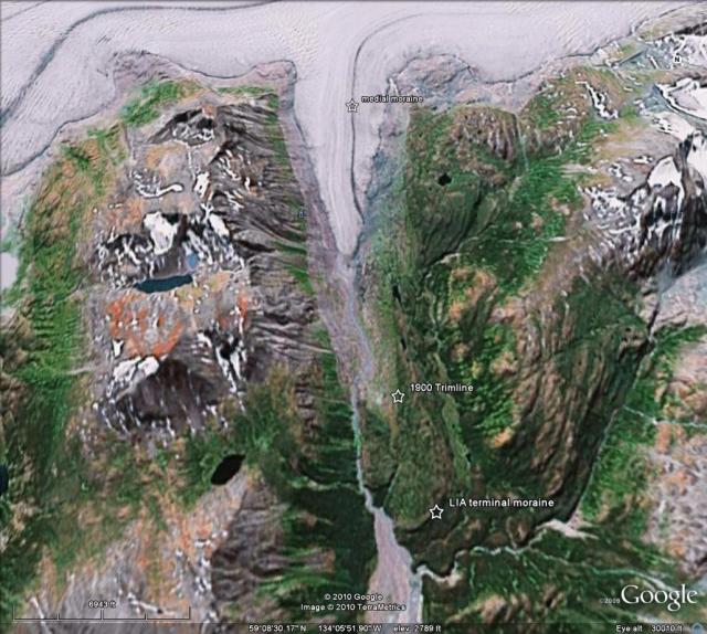 This glacier has receded 2200 meters since early visitors to the area mapped its terminus around 1910, and 3900 m from its maximum advance of the Little Ice Age. The Google Earth views below are from 2001 images. The glacier has retreated 450-500 m in the fifty years that the Juneau Icefield Research Program has been examining it. The first view is looking up glacier and the next two looking down glacier. In all three a trimline is evident where vegetation has not had time to develop due to retreat of the last 75 years.