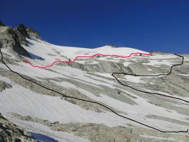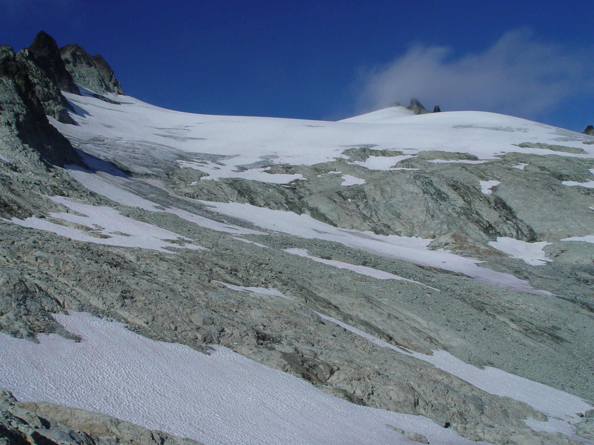 By 2000 this area is just a gentle snow slope over a now stagnant section of glacier ice. The terminus extending to the right is also rising across the entire width of the glacier.