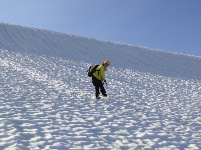 Images from 2007, 2009 and 2010 indicate the continued emergence of new rock outcrops formerly covered by the glacier. The terminus continues to retreat up slope and by 2010 has retreated over 500 meters in 25 years. The loss of area is now 30% of the 1984 glacier area. Note the lines showing the 1985 margin and 2010 margin. In 2009 and 2010 we did not find an area on this glacier with accumulation depths over a large enough area to sustain a glacier. We have measured the glacier’s mass balance each year since 1984. The cumulative loss of -14 meters is nearly a third of the volume lost as well. In 2010 our measurements indicated another year of negative mass balance will occur this year. We measured the snow depth in crevasses and using probing at 90 locations on Daniels Glacier. The steep slope 34 degrees makes for cautious but good glissading down glacier in the last image.