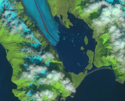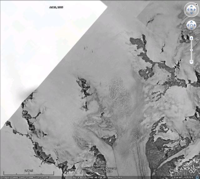 By 1980 the terminus had retreated 1 km, thinned by 150 m, and was calving small icebergs into an ice-marginal lake that was beginning to develop in the still narrow basin. As thinning continued, much of the terminus became afloat by 2000. Bruce Molnia, USGS observed that passive calving, characterized by the release of large tabular icebergs from Bear’s low gradient, floating terminus became frequent. Between 2000 and 2007, the terminus retreated about 3.5 km, yielding large icebergs that floated in the lake. The first image is from Google Earth the second taken by Bruce Molnia in 2002 followed by GoogleEarth images from 2005 and 2011. The terminus position in 2005 is in green and 2011 in red, retreat was 400 m during this six year period. The last image is a Landsat image from 8/3/2012 and indicates continued retreat along the east margin and expansion of the length of the calving front. The amount of calving has declined from the period of more rapid retreat from 2002-2008.