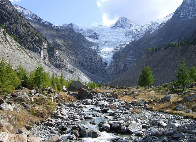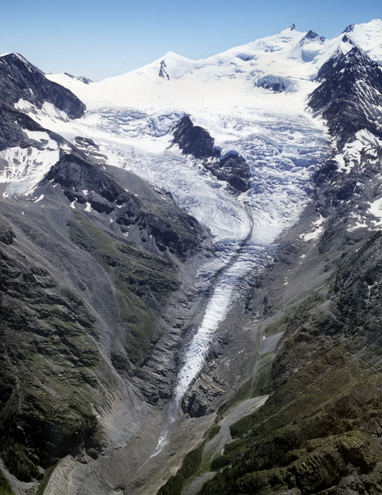 Ried Glacier is beneath the Durrenhorn in the Pennine Alps of Switzerland. The glacier was 6.3 km long in 1973. In 2010 the glacier is 5.1 km long. From the Swiss Glacier Monitoring Network annual measurements, Ried Glacier retreated 300 m from 1955-1990, 8 meters/year. From 1990-2008 retreated an additional 300 m, 30 m/year. Than in 2009 the glacier retreated 500 m. A comparison of a 2004 image taken by M. Funk and a Sept. 2008 image from D. Gara