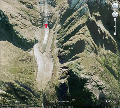 indicate why the change was so abrupt. The glacier had been retreating upvalley with a long gentle terminus tongue. This section of the glacier separated from the glacier in late 2008, with the terminus now ending on a steep rock slope. There is still stagnant ice in the valley below the end of the current glacier. It is heavily debris covered and no longer connected to the glacier system. This glaciers recent rapid retreat parallels that of Dosde Glacier, Italy and Triftgletshcer, Switzerland and Rotmoosferner, Austria. A look at the glacier system and the terminus in Google Earth imagery provides a broader view of the glacier behavior. The terminus in this image still extends downvalley with the low sloping tongue that is now separated. Current terminus marked with red-T.