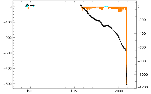In the imagery above the glacier is still connected to the terminus tongue. It is evident that the glacier has two primary icefalls at that time. The upper icefall is the location of the annual snowline, where accumulation tends to persist throughout the year. Below this point only seasonal snowfall is retained. The retreat history from the Swiss Glacier Monitoring Network is seen below.