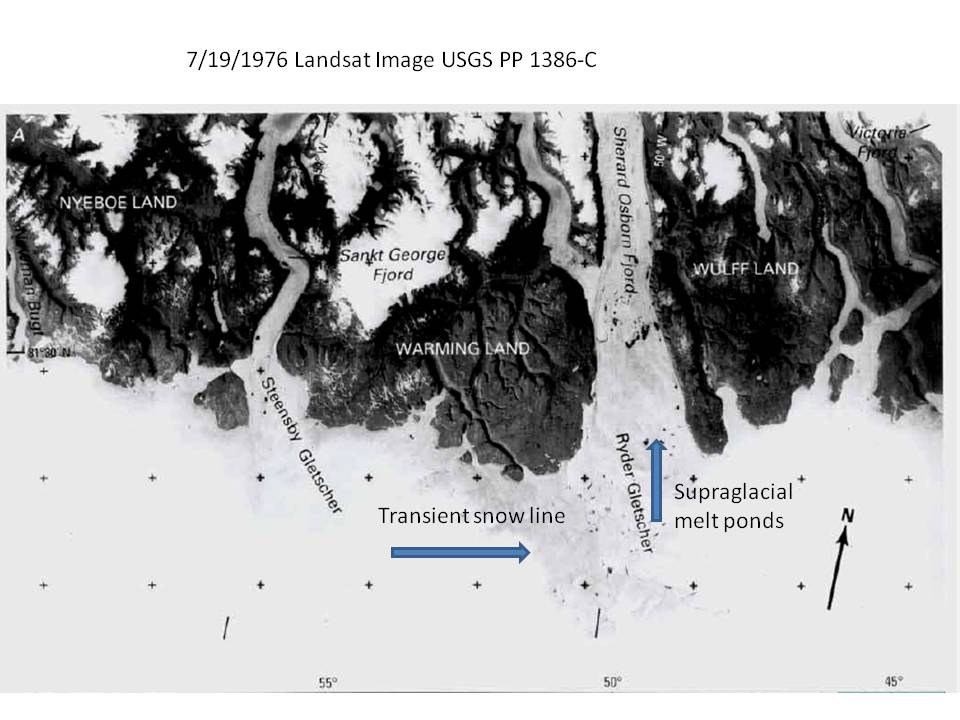 HPS-12 Glacier in 1985 and 2017 Landsat images. The red arrow indicates 1985 terminus, yellow arrows the 2017 terminus, purple dots the snowline and 1-4 are tributaries. By 2017 all tributaries have detached and the glacier has retreated 13 km. HPS-12 is an unnamed glacier draining the west side of the Southern Patagonia Ice Cap…