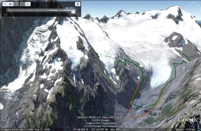 White Glacier descends the Northwest flank of Mount Olympus in Olympic National Park in Washington. The glacier had a very large retreat from its Little Ice age maximum to 1952 of 3200 meters (Heusser, 1957). At that time it was joined with its more famous neighbor Blue Glacier, which is also retreating today. From 1958-1980 the glacier advanced a small distance, the 1950 based map of the area shows the terminus location of the glacier at that point. The burnt orange line indicates the map terminus, the forest green line the 1990 terminus. The Blue Glacier advanced nearly 200 meters in this interval