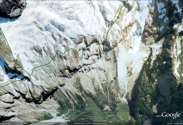 Redoubt Glacier, Washington is the northern most large glacier in the North Cascades. It drains into Depot Creek which flow north into British Columbia. The glacier began advancing in the 1950’s reaching the edge of steep cliff and in three locations spilling down this cliff. At the time of my first visit in 1984 the glacier was still advancing, 2 meters during that year. By 1988 it had begun to retreat, 22 meters total, as all North Cascades were by 1990. The glacier as shown in USGS maps based on aerial photographs, illustrates the margin of the glacier in 1978, this glacier margin is outlined in dark green and is apparent in the several Google Earth images used below. By 1984 photographs by Dale Kalamasz, though I was there, his photographs are much better, illustrate the extent of the glacier.