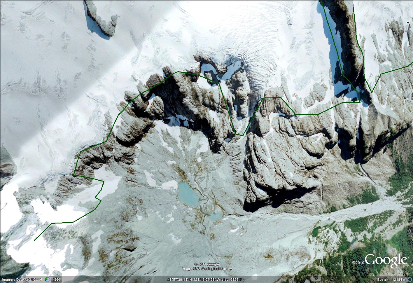 If you looked up at the glacier from the small lake below the center of the margin, “Ouzel lake”, picture above the green line indicates the 1984 margin and the retreat since. It is typical for broad glaciers like the Redoubt to have less terminus retreat. The terminus change is evident in another view, the two lower images of the glacier from the 2009 Google Earth view and a photograph from 2009.