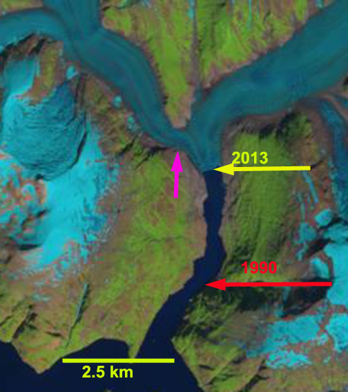 The green line down fjord marks the 1961 terminus, the upfjord line is at the 1100 foot contour of the USGS map and is parallel with the current terminus location. The snowline of the glacier was noted to be at 1125 meters by Pelto (1987), using Landsat images. At the time usable images were rare. Today images are acquired daily by MODIS and if the weather is clear, which is not common, the snow line is evident. Recent satellite images from 2006 and 2009 indicate the snow line still in the 1100 to 1200 meter elevation region, however, the 300+ meter thinning at the terminus has led to thinning upglacier and the location of the 1100 meter contour has shifted 1-1.5 kilometers upglacier. The snowline is evident in the 2003 Google Earth image. Landsat images from 1990 to 2013 indicate extensive retreat. The retreat from the 1990 terminus, red arrow, to the 2013 terminus, yellow arrow is 2.8 km, 120 m per year. The western feeder just above the terminus has narrowed at the pink arrow from 1 km wide in 1990 to 500 m wide in 2013. This suggests that retreat will soon lead to separation of Sawyer Glacier with the western arm and eastern arm both continuing a retreat. The 300 meter thinning in the last 50 years has left a sharp trimline beyond the current terminus marking the former ice height, that is well above the current fjord. The glacier is losing mass and retreating as is the nearby North Dawes Glacier.