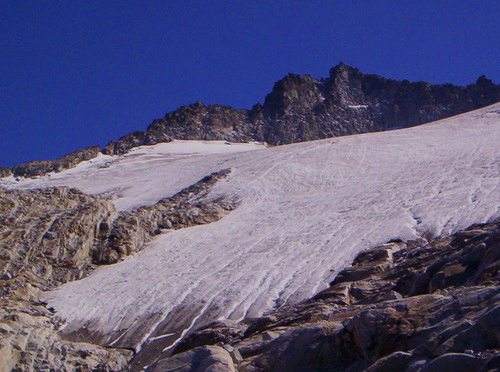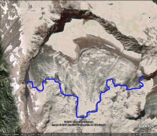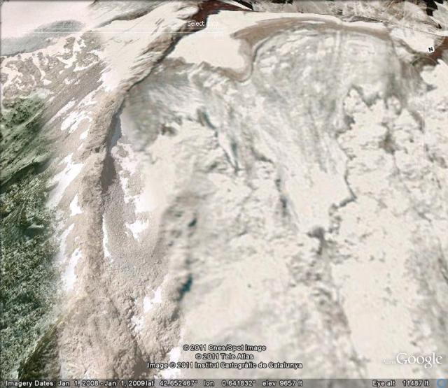 Miguel Arenillas from the Polytechnic University of Madrid has reported thee mass balance from 2001-2009 to the World Glacier Monitoring Service was -8.4 meters. Given the estimated glacier thickness of 30-40 meters, this loss in the last decade represents approximately 25% of the glacier lost in a single decade. The behavior follows that of other Pyrenees glaciers, in 2004-2005 15 of 16 glaciers observed and reported to the WGMS retreated.Chueca et al (2007) identified that these changes have been forced by a reduction in the snowfall contributions and increase in the maximum temperatures during the past few decades in the Pyrenees. The 2008 Google Earth image indicates a glacier almost devoid of snowcover. It is also evident in the Google Earth images and a view of the glacier from below the terminus, that the glacier is quite thin in the lower reaches and has very limited crevassing. Both suggest a glacier with minimal movement. In the first image from 2008 the lower margin of the glacier is indicated by a blue line.