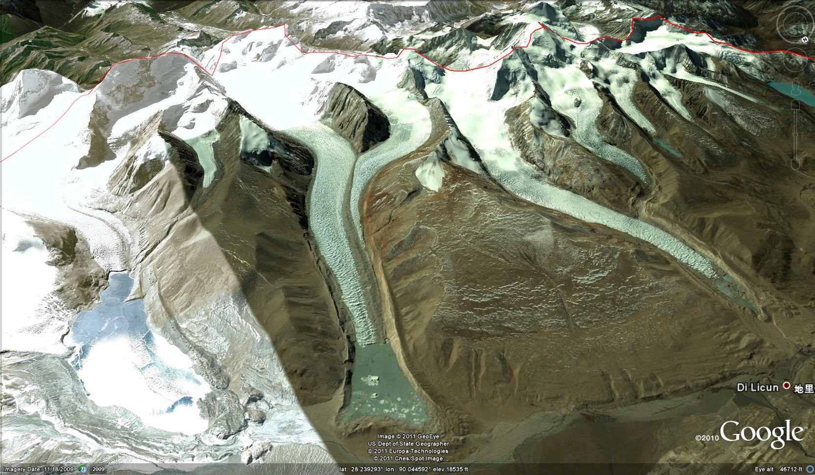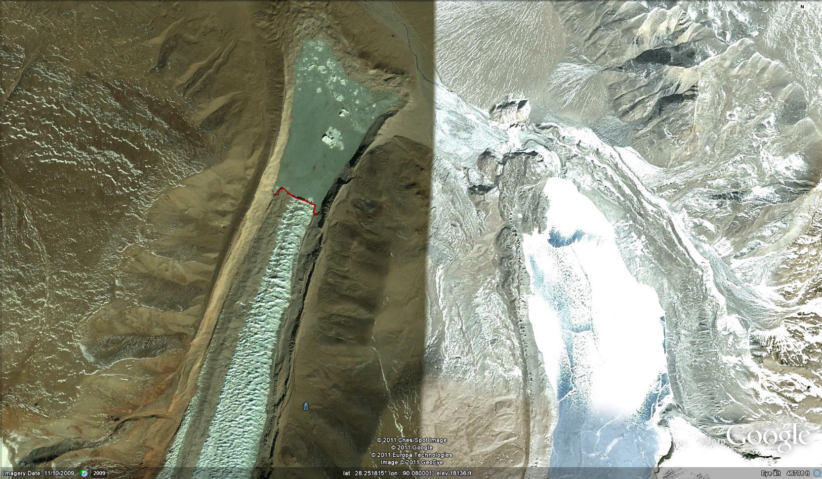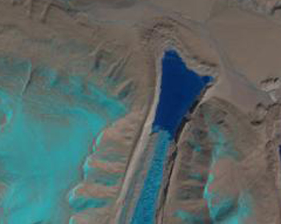 One of the glaciers draining north from Theri Kang in Bhutan terminates in proglacial lake, that is a lake at the glacier front. This is an unnamed glaciers like its neighbors, we will refer to it as the Theri Kang Glacier. The glacier has retreated 1700 meters from the moraine complex that impound the lake. The terminus is at 5200 meters, the snowline is at 5800 meters and the summit of the glacier is near 6700 meters. The vegetation adjacent to the glacier is indicative of the overall dry climate in the region. This is also a cold climate with permafrost in the areas adjacent to the glacier. The lake is not in evidence in maps of the region from the 1960’s. Kääb (2005) in Figure 7b examined the velocity of this glacier using ASTER imagery he found that most of the lower glacier extending from where the tributaries join to the terminus moved at a velocity of 50 m per year. A comparison of this 2001 image overlain in Google Earth and the more recent 2009 imagery indicate this glacier has retreated 300 meters in eight years. The 2001 image is from NASA.The red line in the 2001 image indicates the 2009 terminus. The lake has expanded from 1500 meters in length to 1800 meters and now encompasses nearly 2 square kilometers. Often there is concern about glacier lake outburst floods from lakes dammed either by a glacier or impounded, as in this case, by its moraine. For the Theri Kang the moraine complex appears quite wide, and stable and is not of great concern. The 2013 Landsat image does not show significant retreat after 2009. theri kang 2013