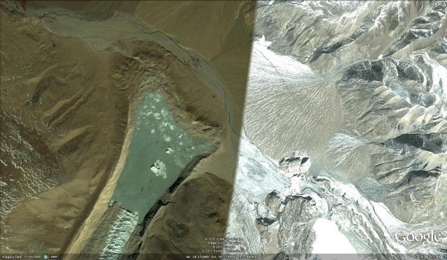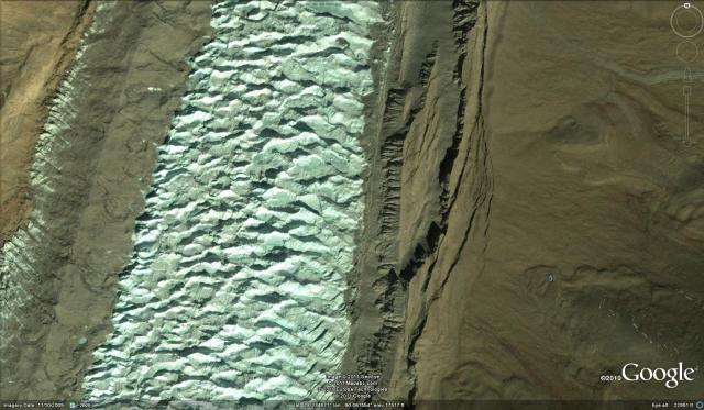 The lower portion of the glacier is debris covered along the lateral margins, but the clean ice portion has an interesting pattern, that is typical of a glacier in a drier climate where sublimation is an important element of the ablation process, dominating over melting. Sublimation is the direct transfer of solid ice to water vapor without melting. That is the crevasse pattern becomes a series of prominent crests almost waves that persists in the absence of the crevasses that formed them. This persistence would not occur in a zone dominated by melting. Though the setting is much different the response to climate is the same as almost all Himalayan glaciers from the Zemu Glacier in Sikkim, to Lugge Glacier, Bhutan, to Imja Glacier in Nepal