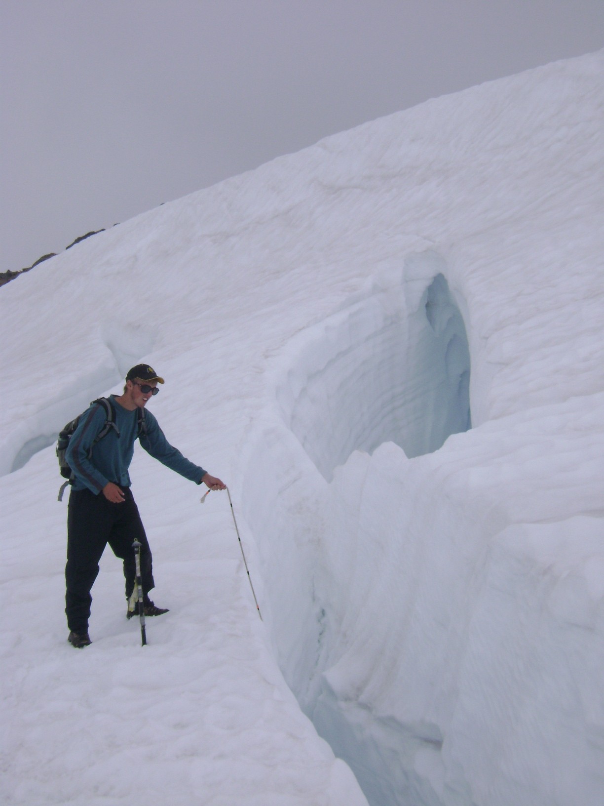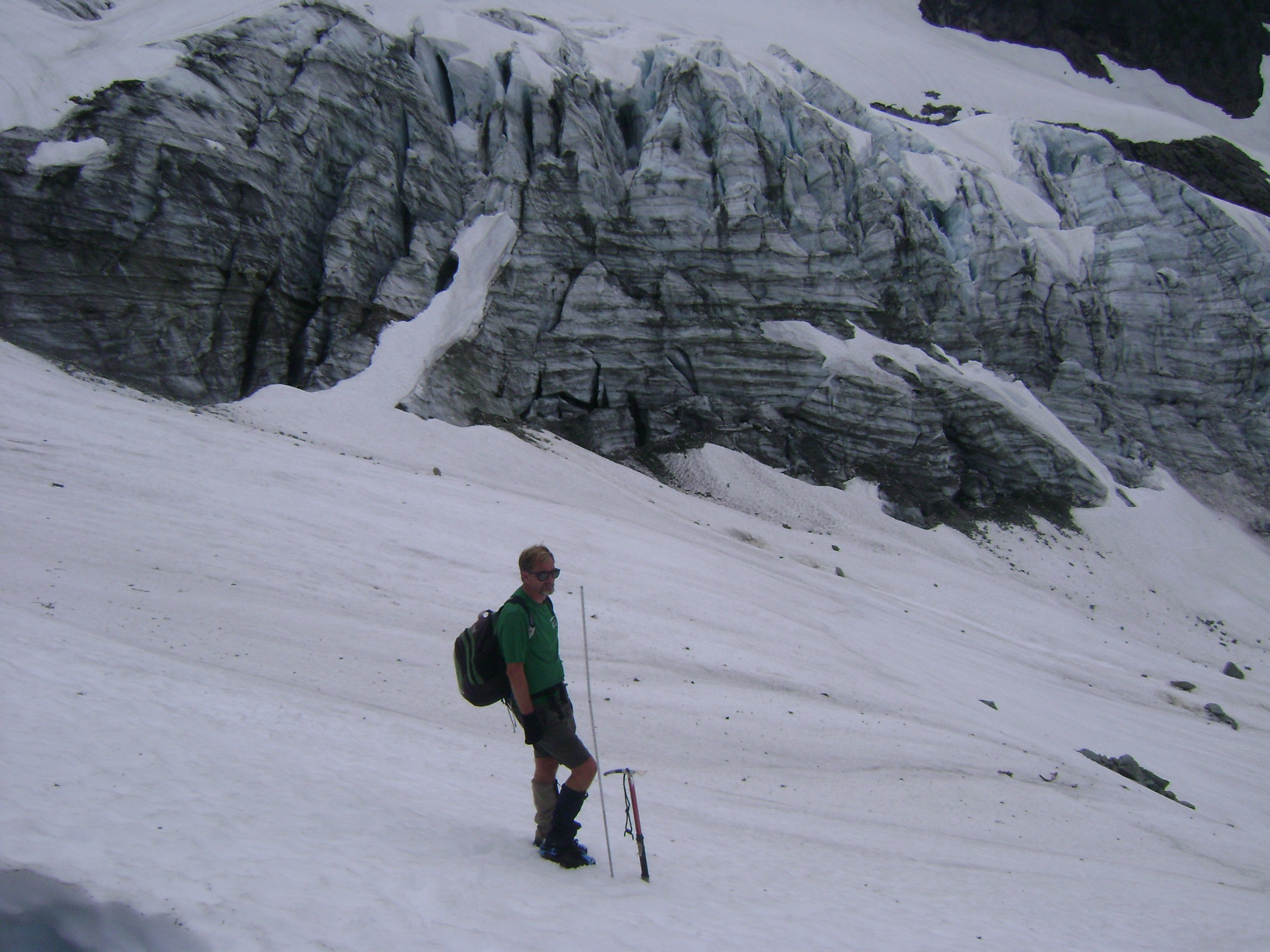 These anti-freeze proteins help keep organisms from freezing solid, by coalescing around ice crystals and limiting their expansion in part due to lowering the freezing point without altering the melting point. For us they could be a critical resource in surgical transplant procedures where keeping organs cold is important. We could have used some kind of protein to keep us warm on the four chilly-cloudy but dry days on the Easton Glacier. We visited Lyman Glacier ascending the former Spider Glacier valley, which was this summer of course still snow filled. Lyman Glacier has lost some of its splendor in the last three years. It had a high ice cliff in 2008 and 2009, measured at 18 meters that has now diminished to 8 meters The glacier has gone from an average surface slope of 12 degrees in 1986 to 18 degrees in 2008 to 21 degrees in 2011, as it continues a rapid ice loss. The steepening results from more rapid thinning at the terminus and overall glacier shortening as the 10 meter per year retreat continues. On Mount Daniels snowpack was not as extraordinary as at other locations. Snowpack on Ice Worm Glacier averaged 4.6 meters, and on Lynch and Daniels Glacier 4.3 and 4.6 meters respectively, this was 2.5 meters more than average. This area had significantly less above average snowfall than the other field areas. Pea Soup Lake at the base of Lynch was still ice covered. We ascended the Lynch over the bergshrund pictured in last image below with a snow depth from the winter of 6.7 meters.
