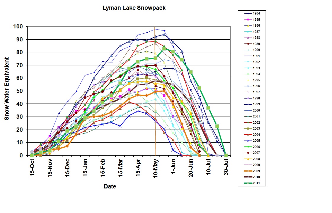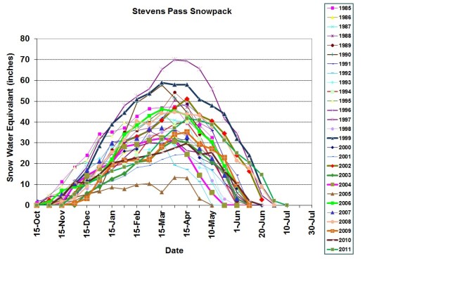 For the 28th consecutive summer the first three weeks of August were spent observing North Cascade glaciers. The 2011 season exhibited unusual snowpack levels second only to 1999 in the last 28 years. In 1999 the world record annual snowfall record was set at Mount Baker, one of our key field research areas. The difference this year was that it was not the winter snowfall that was extraordinary it was the lack of melt through the spring and early summer. A comparison of snowpack at two USDA Snotel long term sites in the North Cascades illustrates that the bright green 2011 on April 1 was ordinary, and that the dark blue 1999 snowpack level was not approached until early June.