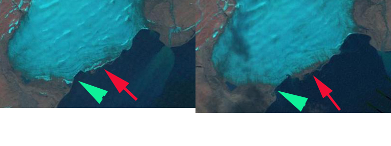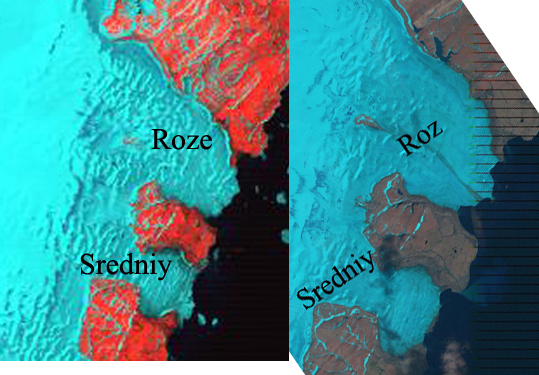 . A closeup pairing of a 2006 (left) and 2011(right) image indicate that Sredniy Glacier retreat is exposing a new island (red arrow) and a new cape is also evident green arrow). On Roze Glacier the combined 2006-2011 image illustrates the retreat on the northeast side of the terminus (red arrow), and the increasing distance from the terminus to a small island (green arrow).
