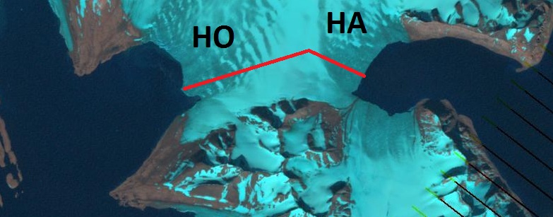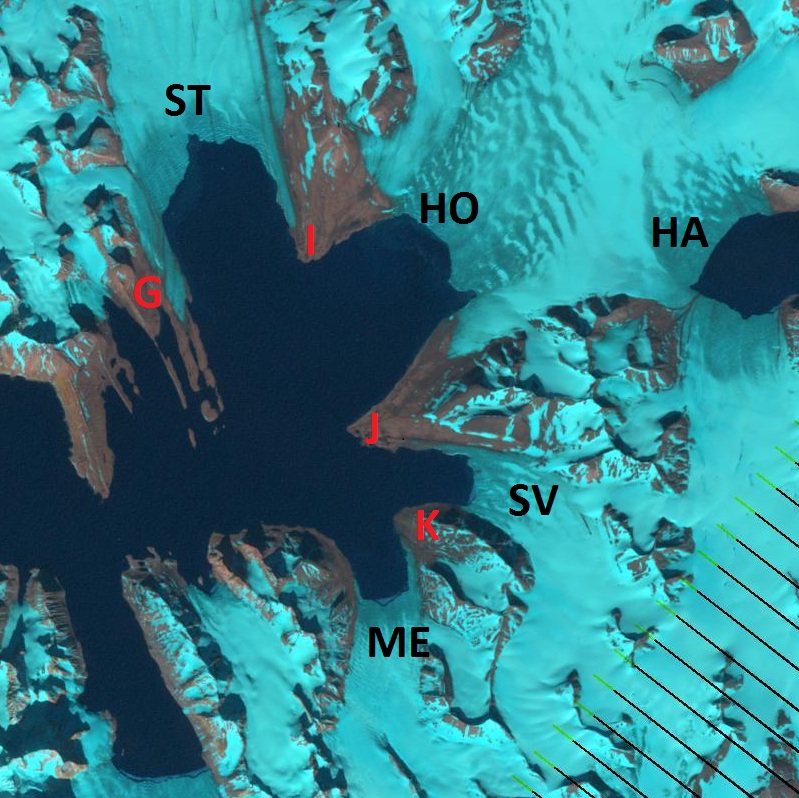 Hornsund is a fjord that in 2010 almost cuts through the southern Island of Svalbard. The Institute of Geophysics Polish Academy have maintained a Polish Research Station in Hornsund since 1957. The 1984 map, from the University of Silesia, of the glaciers and geomorphology document the extent of the glaciers in 1983. At that time the eastern end of Hornsund was fronted by a single glacier terminus comprised of the Sotrbreen (ST), Hornsbreen (HO), Svalisbreen (SV) and Mendelejevbreen (ME). By 2010 retreat has led to the separation of these four glaciers. The top image is the map superimposed on the Landsat image both below, from commenter Andylee.