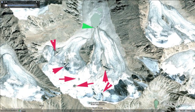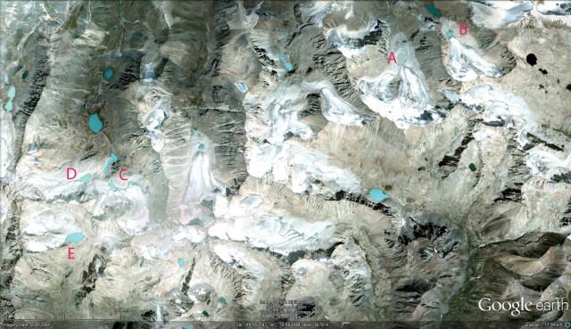 Dzhungharia Alatau range of Kazakhstan is host to over 500 square kilometers of glacier ice. This amount of glacier ice declined by 1% per year from 1956 to 1990, (Severskiy, 2009: 103). This reduction in glacier area parellels that of changes in the Zailiyskiy and Kungey Alatau further south in Kazakhstan and Kyrgyzstan (Bolch, 2006). The Aksu River flows north from the Dzhungharia Alatau into Lake Balkhash. This post focuses on several glaciers in the Aksu River Basin, Eskeldi District, Almaty Province, Kazakhstan. A 2004 Google Earth image highlights the terminus position of several glaciers (A-E) that end in small lakes that are expanding as the glaciers retreat. It is also evident in this image that the snowcovered extent is low. For a glacier to be in equilibrium 55-65% of the glacier needs to be snowcovered at the end of the melt season. In this case the percentage is below 30%. The lakes at point A and C have expanded, and the glacier at point E is no longer in contact with the glacier, in the 2009 Geoeye imagery. The 2009 imagery is after a summer snow storm, that blanketed the glaciers with a thin snowcover. . The amount of retreat of for the 2004-2009 period is close to 140 meters at Point A, 100 meters at Point C and E. A closeup view of the glacier ending at Point A indicates the terminus position green arrow and the outcrops of rock in upper glacier that indicate thinning of the accumulation zone. A glacier with a thinning accumulation zone will not survive (Pelto, 2010). The second image is of the glacier that ends at point C and D and indicates the lack of snowcover on the small glaciers. . Some on the ground photographs of the glaciers in the region from Tsvetik