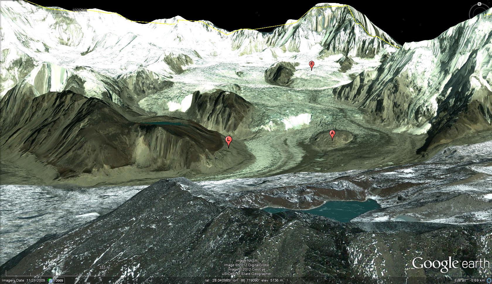 Further upglacier the surface of the glacier is riven with more lakes amidst the debris covered relatively stagnant ice. Further upglacier the thinning is evident in the expansion of a bedrock knob in the midst of the glacier (A), the decrease in surface elevation compared to the lateral moraine-trimline (L) and the quite high equilibirum line for 2009 (E). Strong thinning in the accumulation zone, though less than the ablation zone, of Khumbu Glacier was found by Bolch et al(2011)