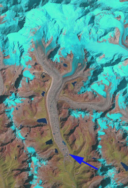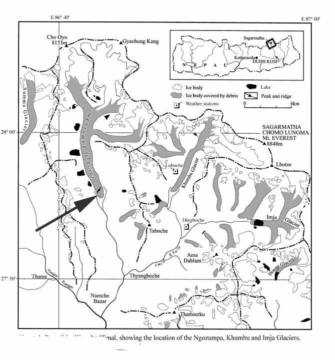 Above image from Doug Benn. From the terminus at 4700 meters to 4900 meters a distance of 8 kilomters the glacier is increasingly riddled with supraglacial lakes (lakes on top of glacier) as this section downwastes. Velocity in this reach is less than 5 meters/year, essentially stagnant. The snowline of the glacier has been at nearly 6000 meters in recent years. On the following image the snowline (blue dots), accumulation areas (A) and terminus blue arrow are indicated. It is evident that more than 50% of this glacier is debris covered.