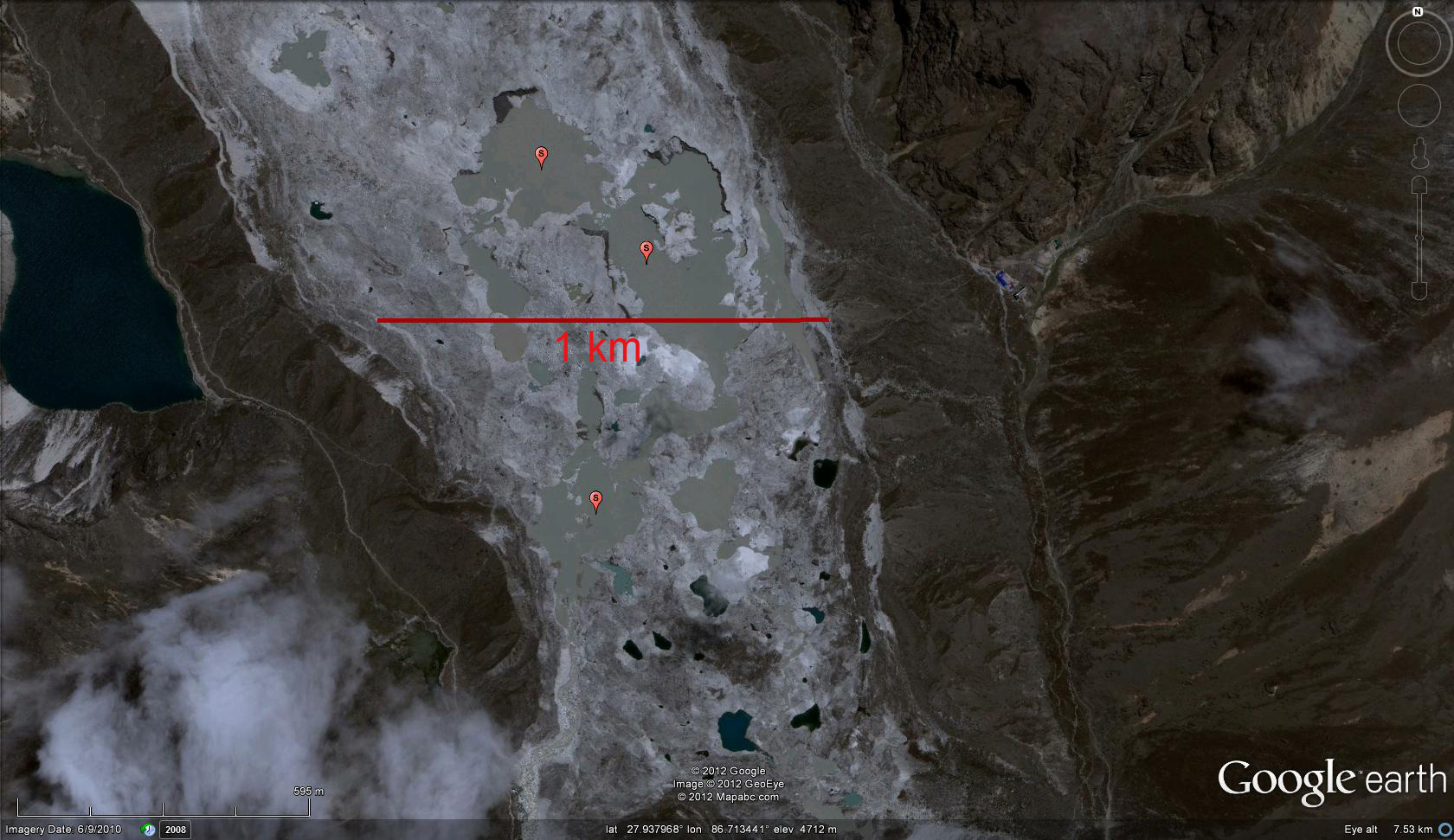 An examination of Landsat imagery from 1992, 2000 and 2009 indicates the expansion of these lakes near the terminus. These lakes (S) in the 2010 (Goggle Earth imagery) are beginning to coalesce and look to be creating a proglacial lake (lake at front of glacier) at the terminus of the glacier. Benn et al (2001) examining the supraglacial lakes hypothesized that the glacier was close to forming a moraine dammed proglacial lake. This is a scenario very similar to what has developed on Menlung Glacier, which is just over the pass into Tibet from the Ngozumpa.