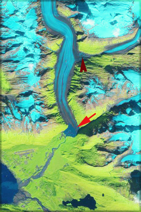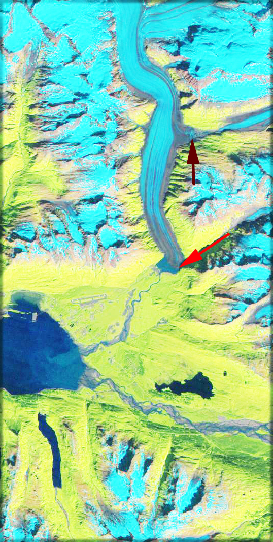 The terminus on each image is indicated in light red. Seven kilometers upglacier of the terminus is a secondary terminus in a side valley. In the 1948 map this terminus also joins the glacier descending the same valley, dark red arrow. With time both glacier termini retreat. By 1987 Landsat imagery indicates the development of a lake at the terminus and that the outwash plain is stabilizing, as indicated by complete vegetation development. By 2001 the west side of the lake is 1.5 from north to south, the east side still extends to the southern shore of the lake. By 2005 the eastern side of the terminus has collapsed and the terminus has retreated 1500 meters from the lakes southern shore. In 2007 Google Earth imagery the lakes is 1700 meters wide, and by 2011 the lake is 2 kilometers from north to south. The images below in order are Landsat 1987, Landsat 2001. Ikonos 2001, Ikonos 2005. Google Earth 2007 and Landsat 2011.