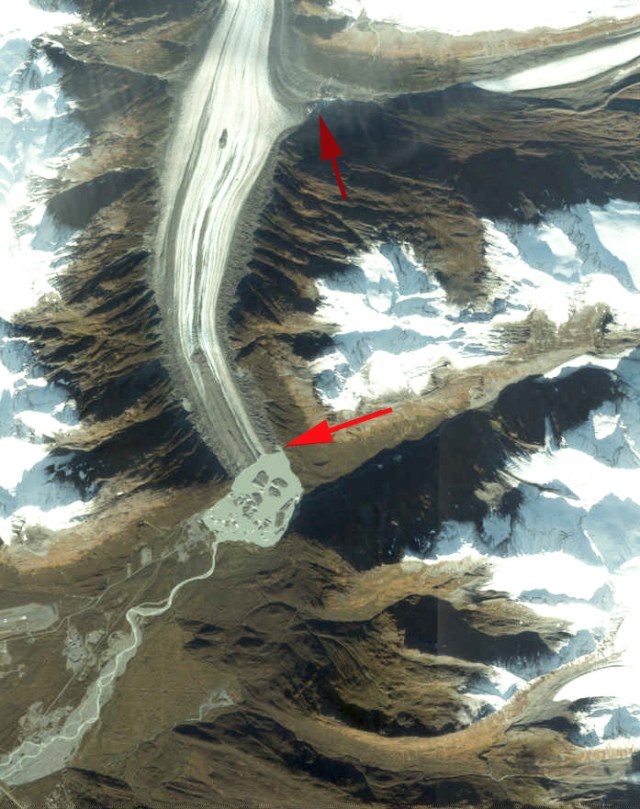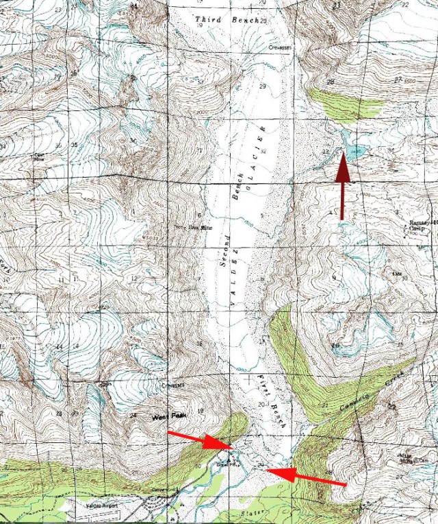 The upper terminus dark red arrow is separated by three kilometers from the glacier descending the valley and now barely enters this side valley. This indicates upglacier thinning that will lead to continued retreat. Valdez Glacier is retreating mostly due to surface melt and thinning and to a lesser extent calving. The lake is not as deep nor the calving as rapid as other area glaciers Yakutat Glacier, Melbern Glacier and Grand Plateau Glacier