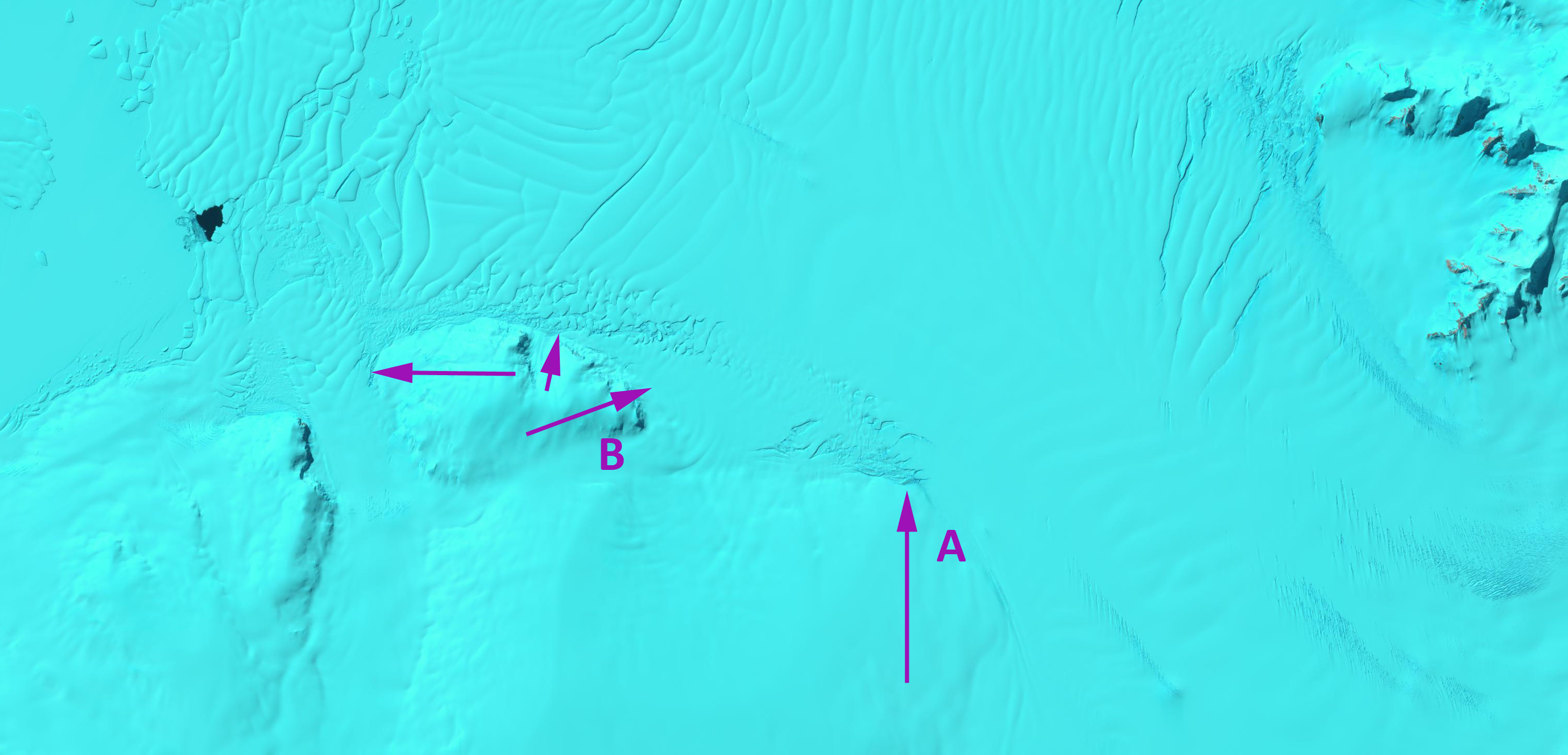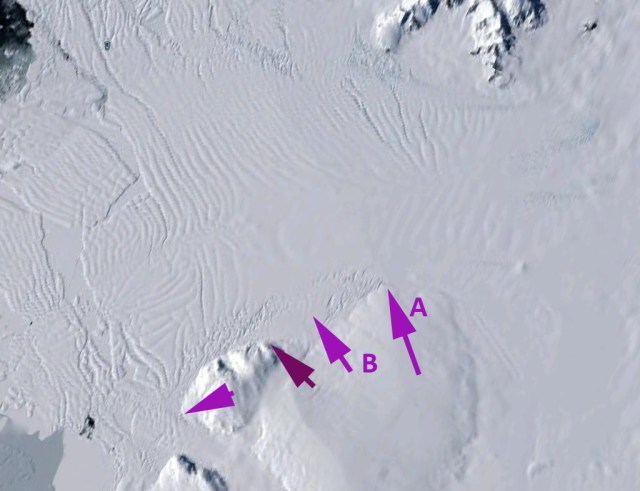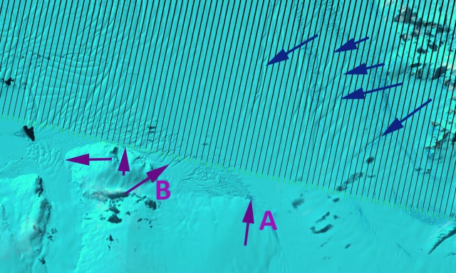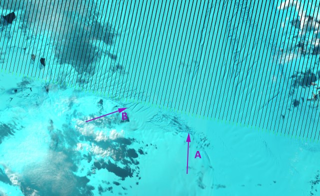 Like on PIG Smith Glacier has accelerated by 500 m/year, nearly doubling its velocity. The loss of buttressing and reduced size of the ice shelf reduces back forces that would allow acceleration. Point A marks the location where attachment is in 2011, Point B marks an area of attachment between the Crosson ice Shelf and the Bear Peninsula in 1999 (top image below) and 2002 (second image). By 2011 (bottom two images) this area around B is not attached and also has expanded rifting.