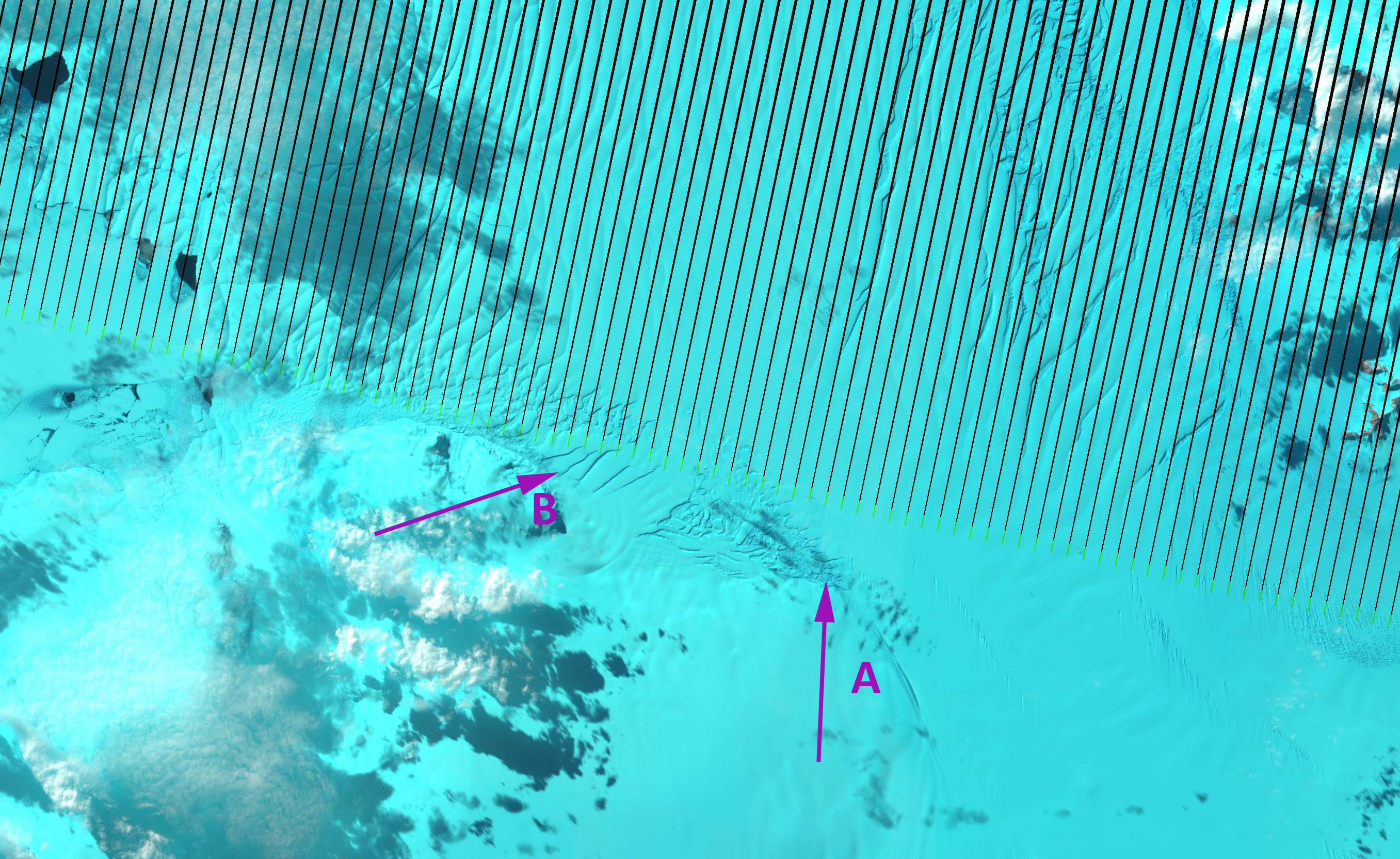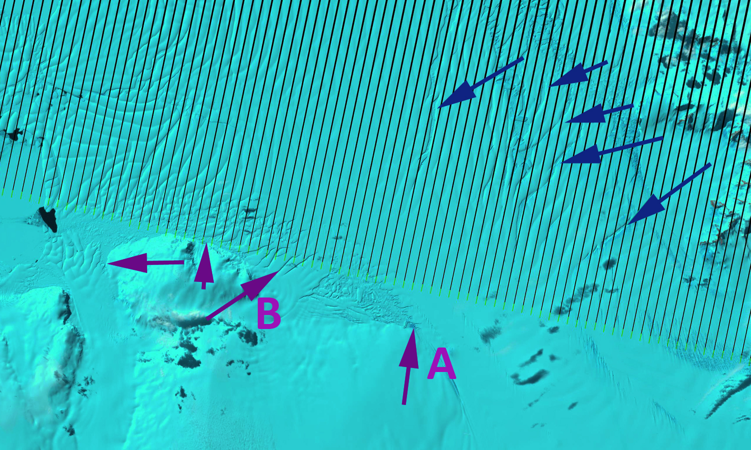 The entire Crosson Ice Shelf is threatened by rifting near Mount Murphy (blue arrows above and green arrows below) that were noted by MacGregror et al (2012). The rifting has expanded in number and extent from 2011 above to 1999 below. The entire ice shelf with acceleration shows considerable rifting, which combined with thinning has been a recipe for destabilization and breakup of ice shelves on the Antarctic Peninsula, such as at Wilkins Glacier, Fleming Glacier and Prospect Glacier. The thinning has been noted as widespread around most of Anarctic Ice Shelves in a paper this week from Pritchard et al (2012). This paper from an international team from British Antarctic Survey, Utrecht University, Scripps Institution of Oceanography and Earth & Space Research has identified the losses are principally the result of increased basal melting from intrusion at depth of warm water. In the Smith Glacier area there is no significant surface melting, so basal melting must be the source.