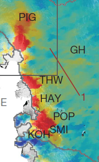 Smith Glacier, West Antarctica is two glaciers to the west of Pine Island Glacier flowing into the Crosson Ice Shelf in the Amundsen Sea. Pine Island Glacier (PIG) has been the focus of more extensive study because of its size and its identification as the weak underbelly of the West Antarctic Ice Sheet. Two recent papers have focused on changes on glaciers in the region. Pritchard et al (2009) identified thinning over almost all of Smith Glacier, thinning near the grounding line and on the floating ice shelf has been 9 m/year from 2003-2007, somewhat more than PIG, top image. Smith Glaciers floating section the Crosson ice Shelf northwestern margin is buttressed by the Bear Peninsula. Since 1984 MacGregor et al, (2012) identified increased rifting and detachment from the peninsula. The peninsula has been a pinning point, detachment can lead to destabilization of the ice shelf. They further identified a 24 km retreat of the terminus since 1990 and a reduced area of attachment and increased rifting near Mount Murphy. The terminus position change is seen in the second image below. The light blue color is 1984 and the red colors are the 2007 and 2011 terminus position, In this post we look at the detachment from the Bear Peninsula.