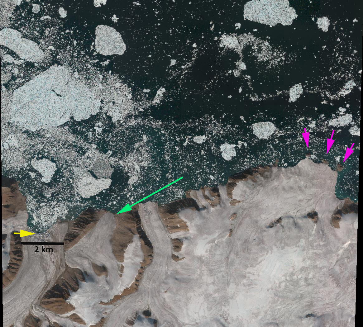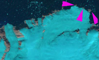 . Further to the east from Belcher and Unnamed5 Glacier there is a set of three islands that are losing contact with the Devon Ice Cap between the 1998 Landsat and 2009 Geoeye imagery, violet arrows 2009. The losses paralell those from other Canadian Arctic glaciers, Penny Ice Cap.