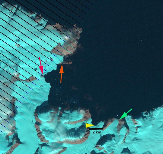 Belcher Glacier and its neighbor Unnamed5 Glacier are the focus of this post. A recent study by Van Wychen et al (2012) focused on velocity changes of the Devon ice Cap. The fastest velocities of 200-250 meters/year are at the front of the Belcher Glacier. A comparison between Belcher Glacier’s velocity from the 1991-2000 period and 2009 indicate that Belcher Glacier velocity has declined at the glacier front recently, which has likely aided the glacier in slowing retreat, an excellent time lapse gives a sense of the dynamics. Here we used 1998 (top), 2008 (second image) and 2010 Landsat imagery(bottom image) combined with Geoeye imagery (third image)from 2010 to identify changes in glaciers adjacent to the Belcher Glacier. To the north of Belcher Glacier a small nunatak is evident at the red arrow. This nunatak is 500 meters inland from the terminus in 1998 and is at the terminus in 2010. The orange arrow indicates the terminus of a land terminating glacier which in 1998 reached a small inlet in the peninsula emerging from under the ice cap. By 2010 the glacier has pulled back 250 meters from this inlet. The yellow arrow indicates the terminus change of Unnamed5 Glacier. The glacier has pulled back to the base of a zone of intense crevassing between 1998 and 2010 a retreat of 500 m. The next glacier to the east in 1998 has a 600 meter wide margin in the ocean. By 2010 the glacier front is in contact with the ocean for less than half this length.
