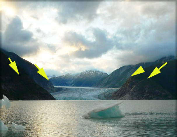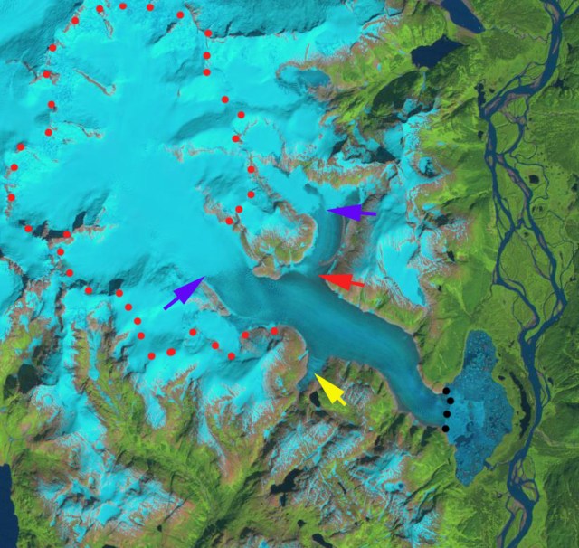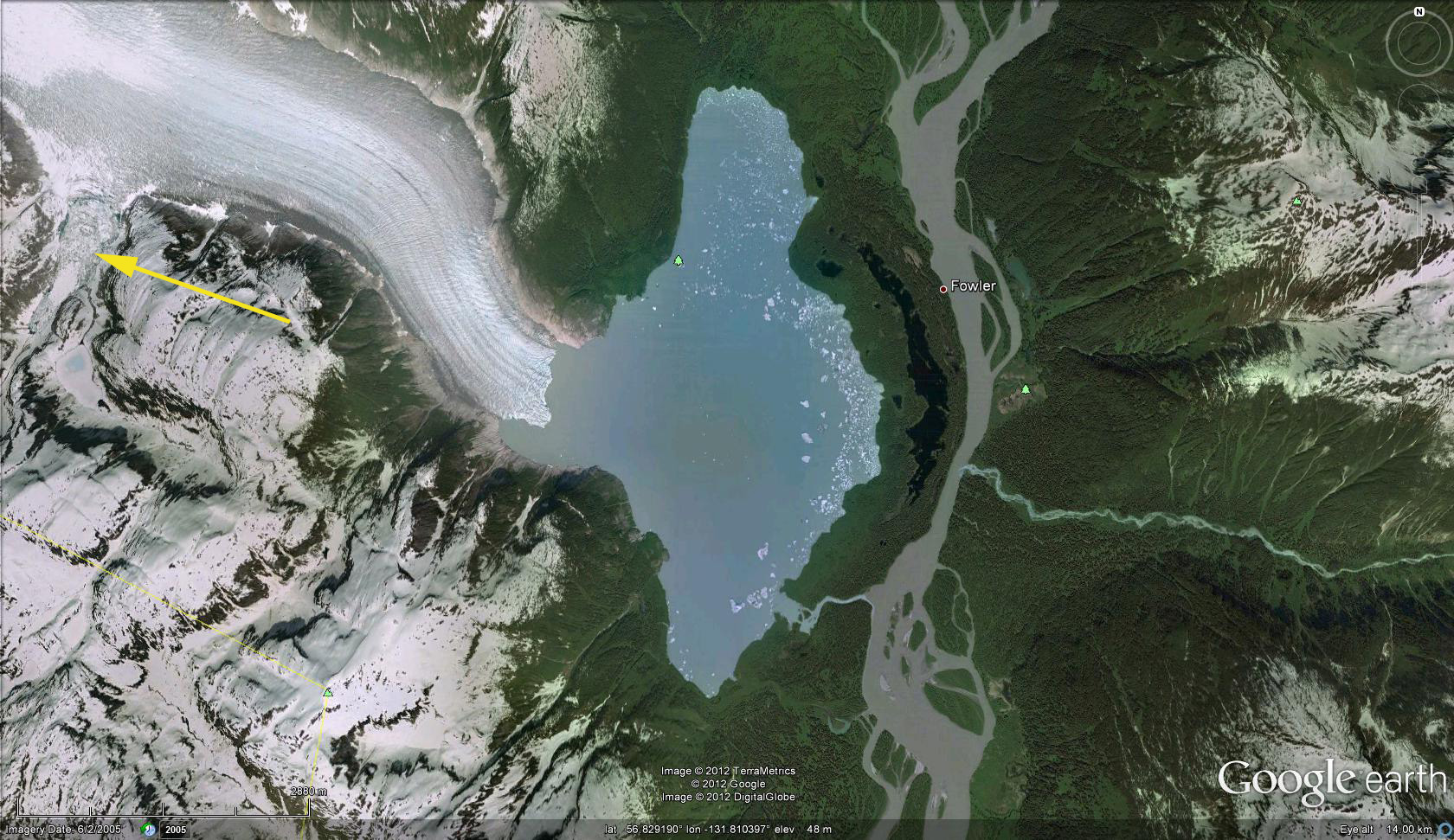 Great Glacier is following the pattern of behavior of other Stikine Icefield glaciers such as Sawyer Glacier There is a glacier dammed lake that has to date changed little at the yellow arrow, this lake fills and drains under the glacier periodically, top image below. A view of the glacier from across the lake today indicates the distance to the now valley confined glacier, and the trimlines of the former ice surface, yellow arrows in middle image The Great Glacier has one major tributary on the northeast tributary that is very low in elevation with a top elevation of 800 m. Given the regional snowline of 1100-1200 meters (Pelto, 1987)this is too low to retain snowcover through the summer and will lead to progressive thinning. This branch of the glacier has and will thin faster than the rest of the glacier and is doomed given its limited top elevation. The proglacial lakes on its periphery will continue to grow as this downwastes, green arrow bottom image.