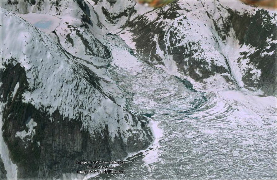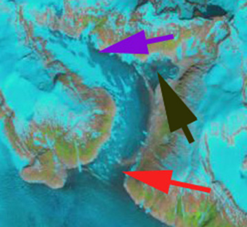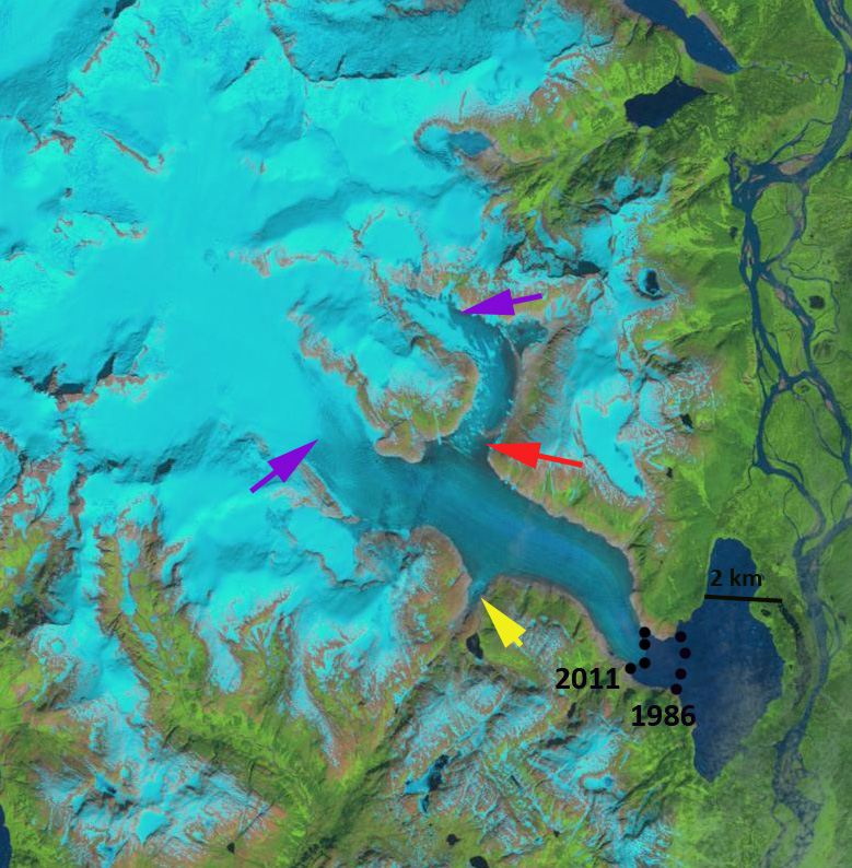 A comparison of 1986 Landsat, 2005 Google Earth and 2011 Landsat imagery illustrates the retreat. The yellow arrow indicates a glacier dammed lake, the violet arrows the snowline and the red arrow the northeast tributary. By 1986 the new lake had largely developed, and the glacier was beginning to retreat into the mountain valley above the lake. Retreat from the moraines of the late 19th century was 3200 m. By 2011 the glacier had retreated further into valley, 900 m retreat from 1986-2011.