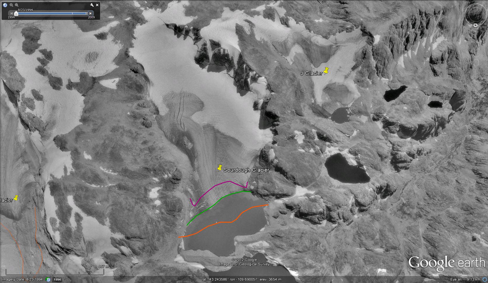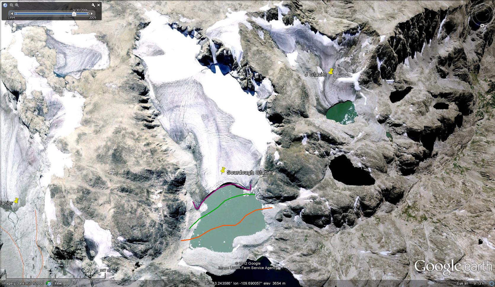 The total surface area of the 44 glaciers was estimated to be 45.9 km2 in 1966 and 28:6 km2 in 2006, a decrease of 42%. The retreat has varied from substantial on Minor and Grasshopper Glacier to limited on Upper Fremont Glacier. For Sourdough Glacier the 1966 USGS map of the area based indicates the glacier ending in a small lake, orange line in images. We use 1994, 2006 and 2009 images in Google Earth to examine the glacier changes. By 1994 (green line) the glacier had retreated 160 meters and the lake nearly doubled in size. By 2006 (magenta line) retreat from 1966 was 280 meters with a more pronounced calving face developing. In 2009 the calving face remains and the glacier had retreated another 20 meters overall, 40 meters in the glacier center. The increased height of the calving face suggests the lake is deeper than at the 1994 terminus position and that the lake will continue to expand with further retreat. The calving front and slope of the glacier is similar to Lyman Glacier. The retreat from 1966-2006 is a 20% reduction in overall glacier length.