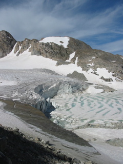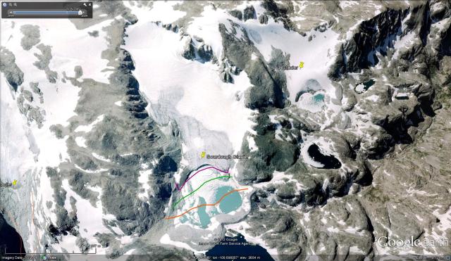 Sourdough Glacier descends the north side of Klondike Peak in the Wind River Range of Wyoming. Thompson et al (2011) identified the loss in area of Wind River Glaciers from 1966 to 2006.