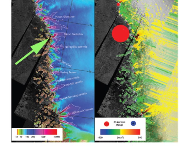 Returned from the field yesterday. There was spectacular melting and forest fires in our field area of the North Cascades, Washington. Preliminary results will follow in 10 days. Alison Gletscher in western Greenland at 74.37 N and 56.08 W,had a spectacular retreat in the last decade. The 11 km retreat has been noted by Howat and Eddy (2011) and Joughin et al, (2010). The velocity of the glacier is typical of marine outlet glaciers increasing dramatically near the ice front to 3000 meters/year, image from Joughin et al, (2010).