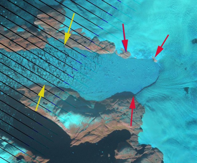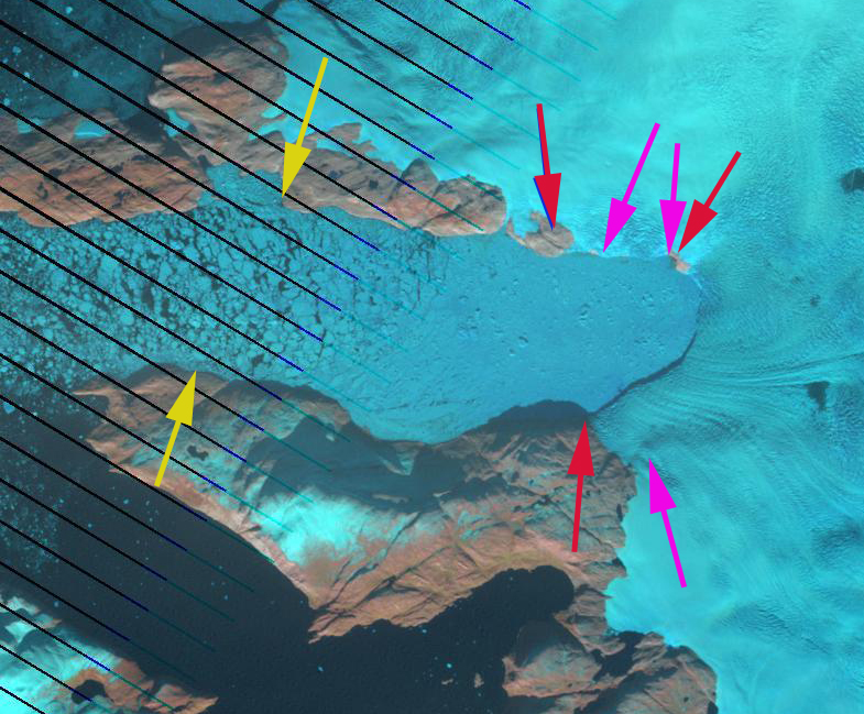 . The glacier’s calving front is much longer than in 2000, however, there are a number of pinning points, purple arrows in image below that reduce the glacier velocity on the northern and southern margin. However, the high velocity, extensively crevassed middle section is still retreating.