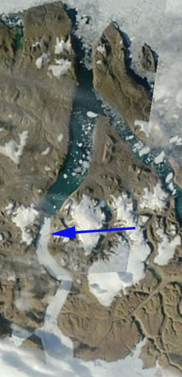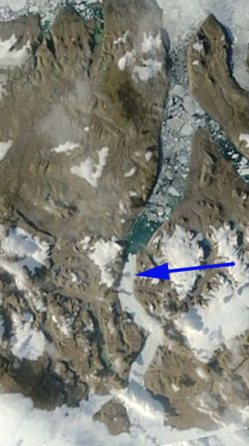 Steensby Glacier flows north from the Greenland Ice Sheet into the Arctic Ocean between Petermann Glacier to the west and Ryder Glacier to the east. The glacier terminates 100 km up the twisting Sankt George Fjord from the ocean after flowing 60 km down the twisting valley from the ice sheet. This distance and the fact that the fjord empties into the Arctic Ocean would suggest it is less easily reached by warming ocean water to melt the floating glacier tongue. The glacier has a thin floating ice tongue like Petermann Glacier at the terminus with a thickness of 75-105 m. The terminus as a result has a low velocity and would not accelerate and retreat via the same mechanism of backforce reduction that has led to retreat of almost all marine terminating outlet glaciers that do not have large floating ice tongues. The snowline was noted as 800 m in the 1970-1980’s, has in recent years been 1000 meters (Pelto, 2010). With the warm weather the past two summers it has seemed inevitable that Ryder and Steensby Glacier would have a terminus response. Steensby had last been observed in retreat back in 1947 (Ahnert, 1962). From 1947 to 1976 and since 1976 has changed little. On my return from glacier field work I checked the MODIS daily imagery from 8/15 and saw nothing. This glacier seemed a particularly likely culprit for retreat this summer because the terminus area is such a melange of ice as seen in the 2006 Landsat image (M),and as Ahnert had observed, the crack that created the icebergs is likely the same one visible in 2006, blue arrows.