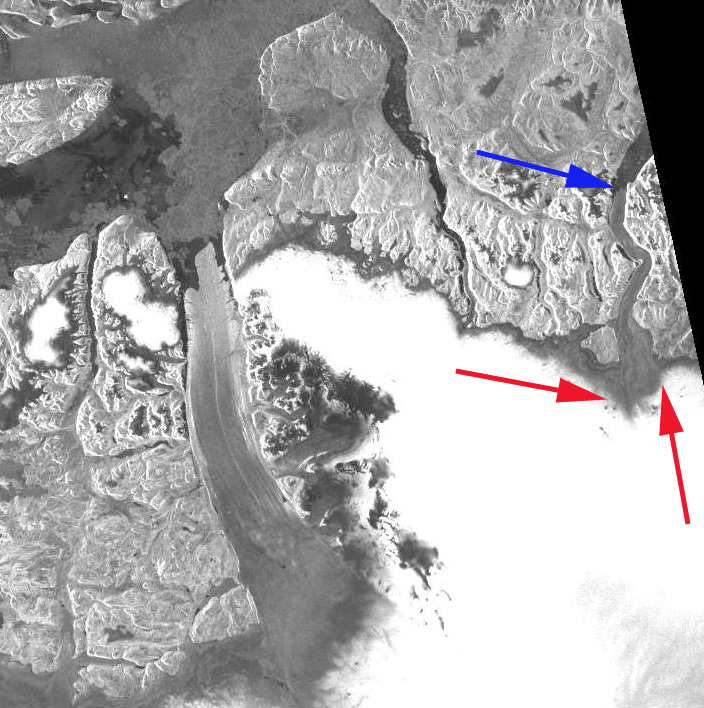 I have been waiting for two years for a more appreciable terminus change from Zachariae to focus on it. It is certainly along with 79N a very important glacier in terms of tapping the interior of the GIS along with Petermann and Jakobshavn the most important. The retreat has not been that fast in my mind. This separation must be what Espen meant by the split. I will pull up some Landsat imagery to illustrate the point in the next day.